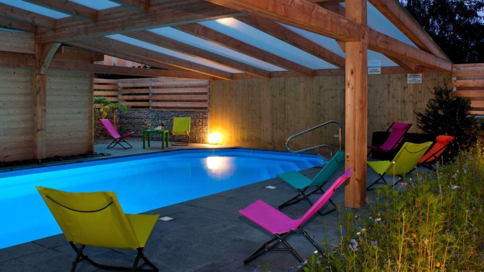Durant les beaux jours, vous profiterez du jardin et de la terrasse en bois pour prendre un bain de soleil ou siroter un verre. La piscine extérieure semi-couverte, chauffée et aménagée de transats colorés vous offrira un agréable moment de détente à toute heure de la journée.
